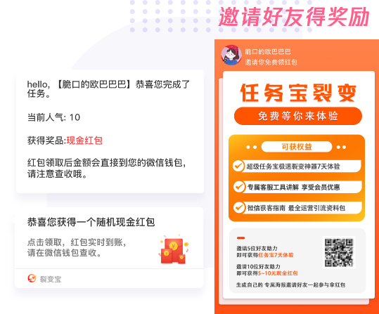 通过任务宝、转发宝等高 效裂变工具帮助您迅速涨粉